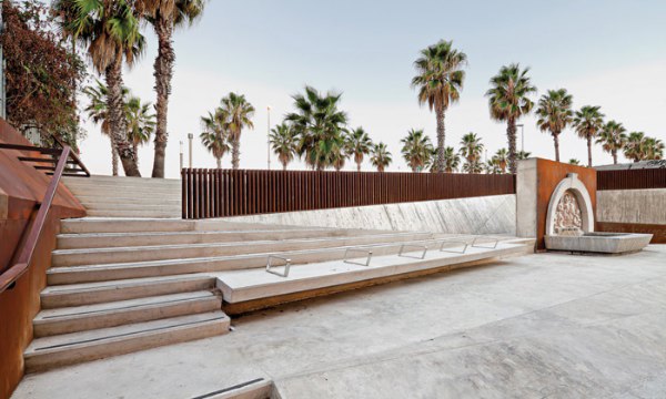 整個工程只采用了兩種建材,斜坡、臺階和墻壁使用了混凝土,欄桿和覆蓋層則使用了柯爾頓鋼。廣場圍墻使用的是混凝土加木材。光線從兩點照射過來,強調了噴泉的價值和全新的空間。